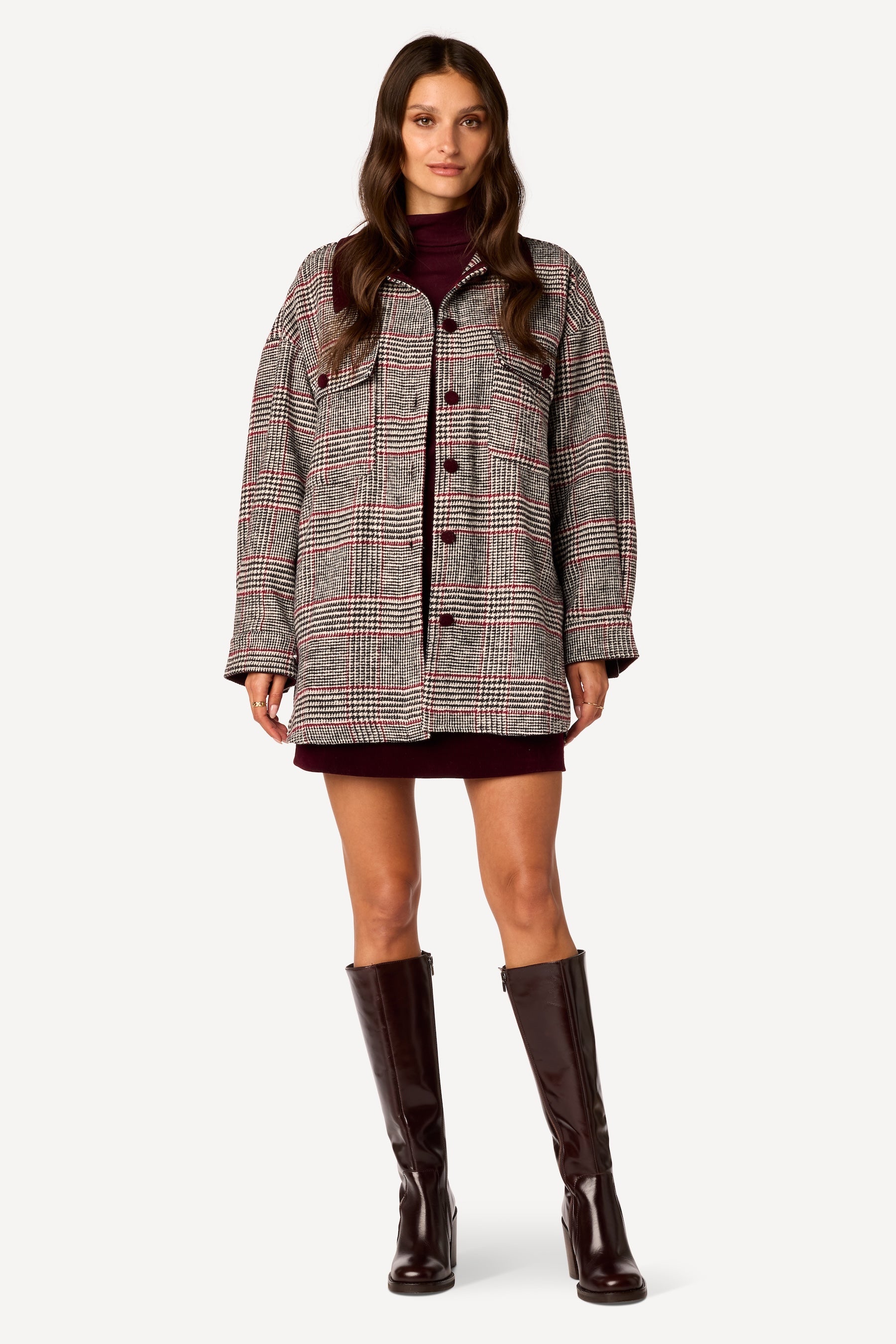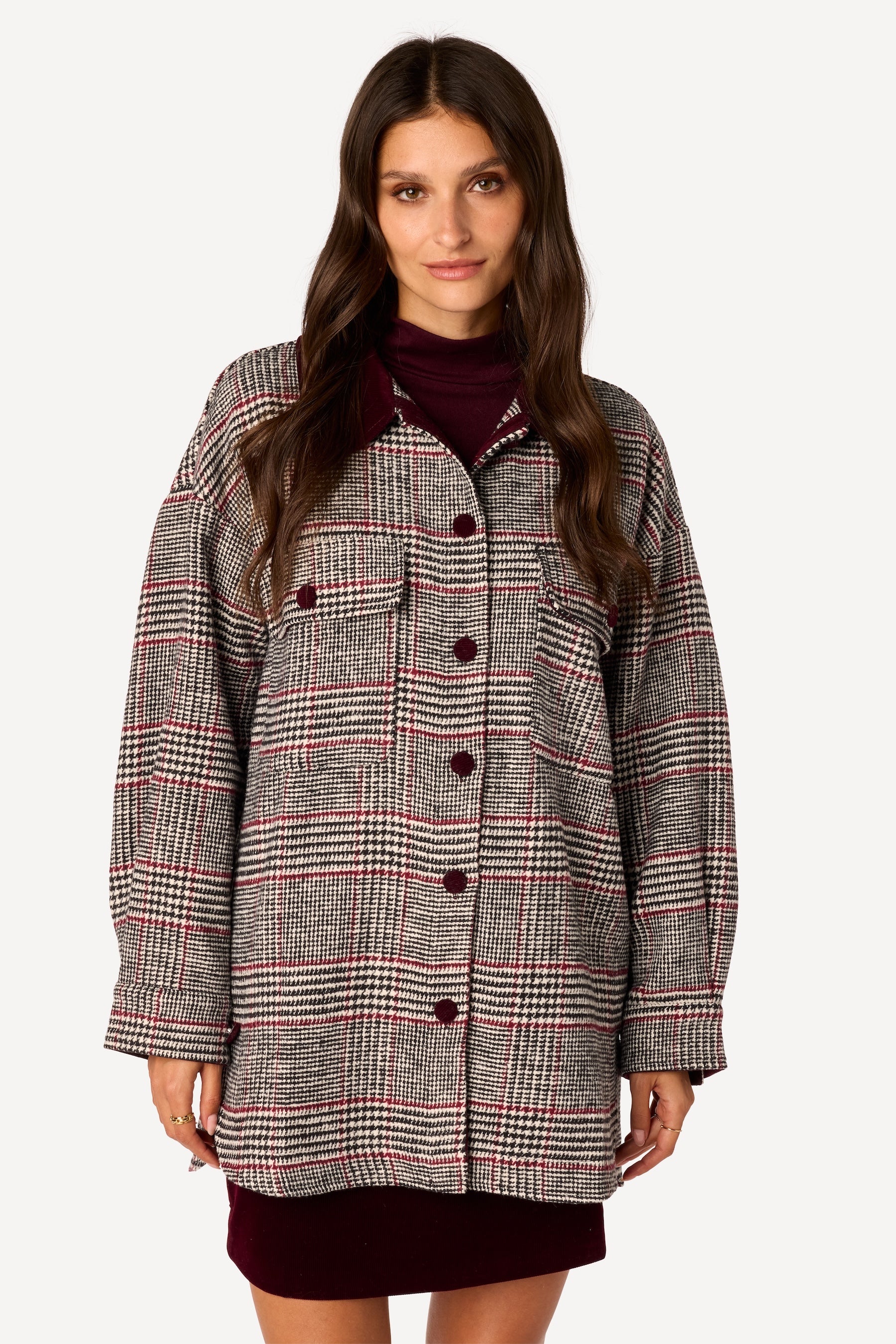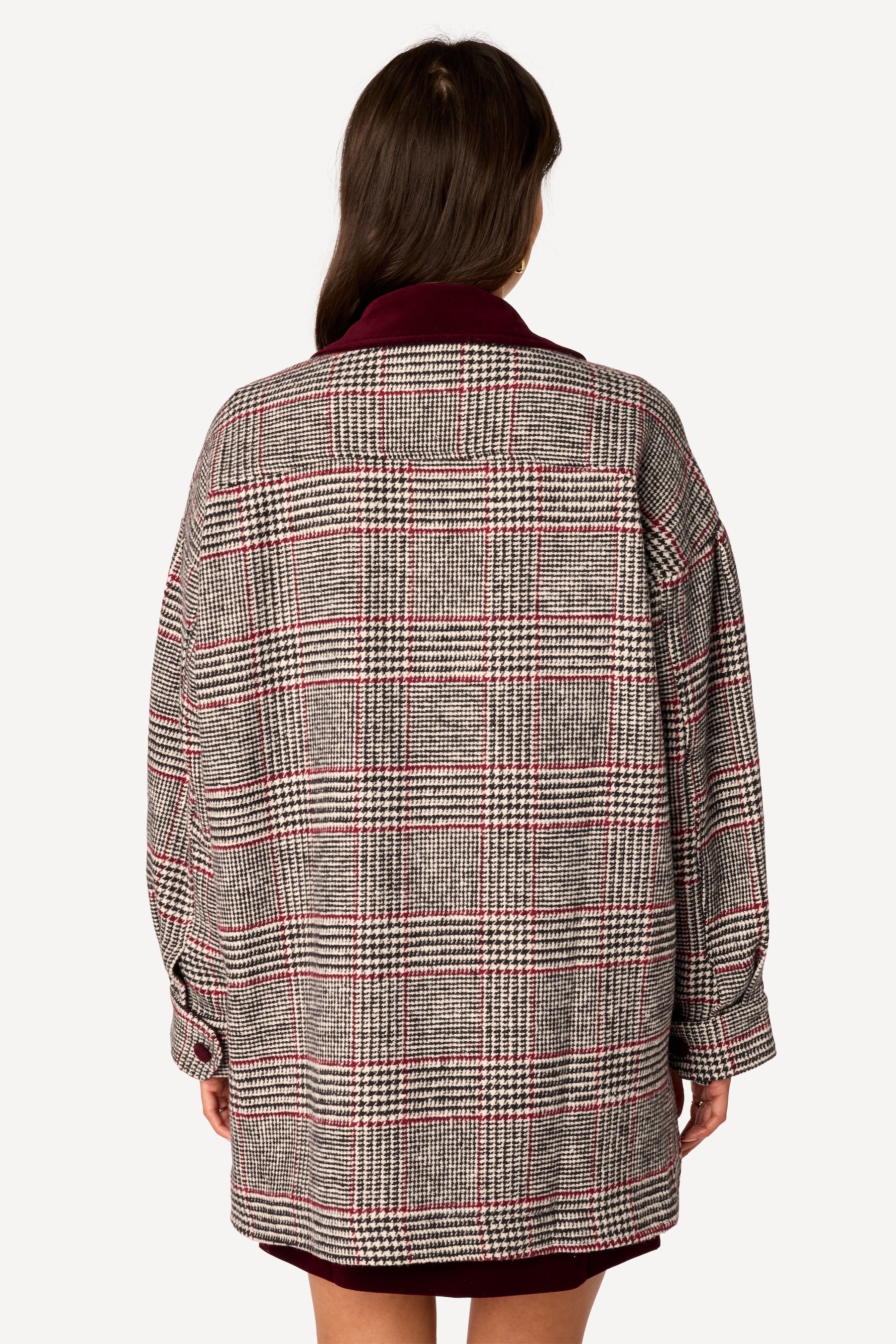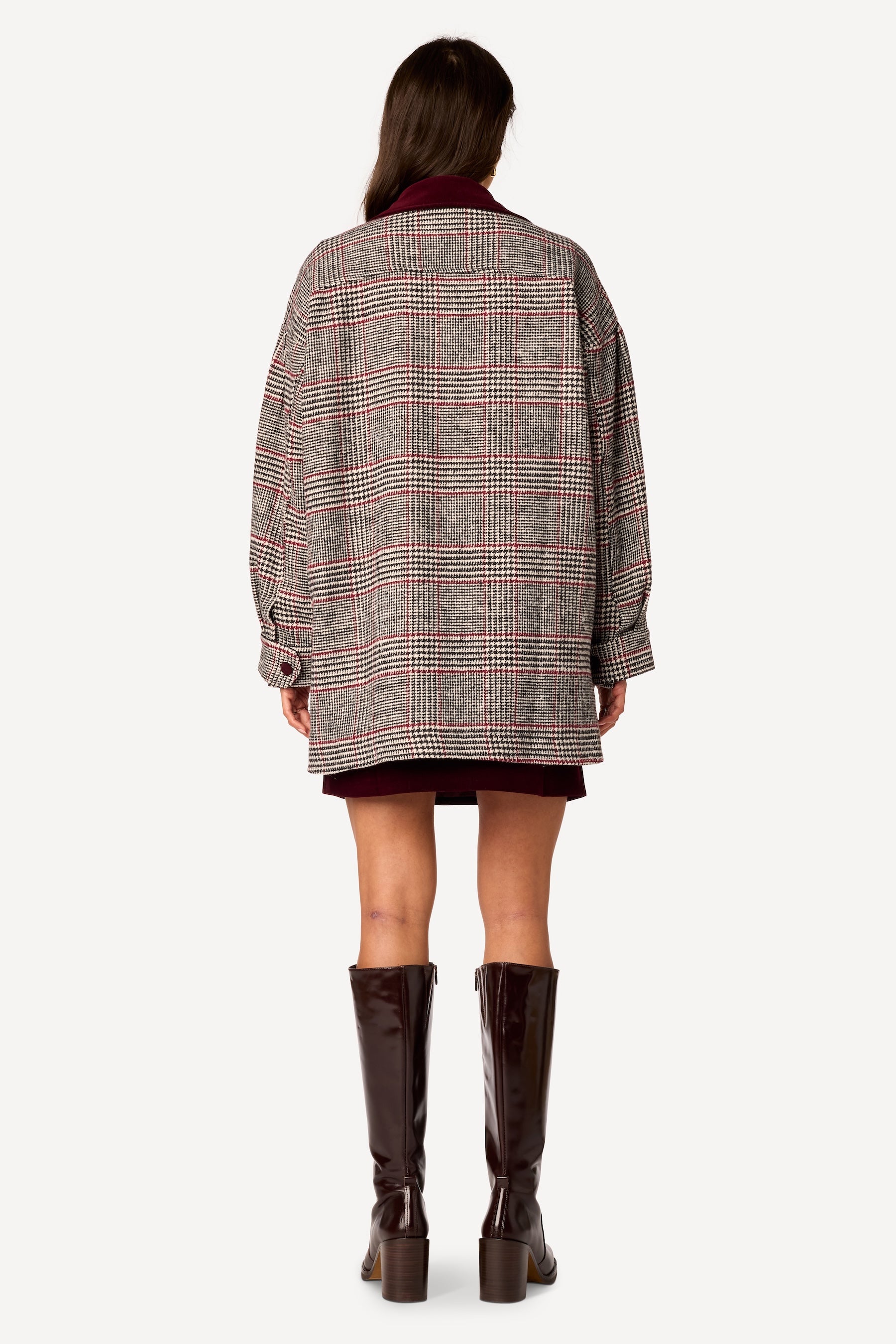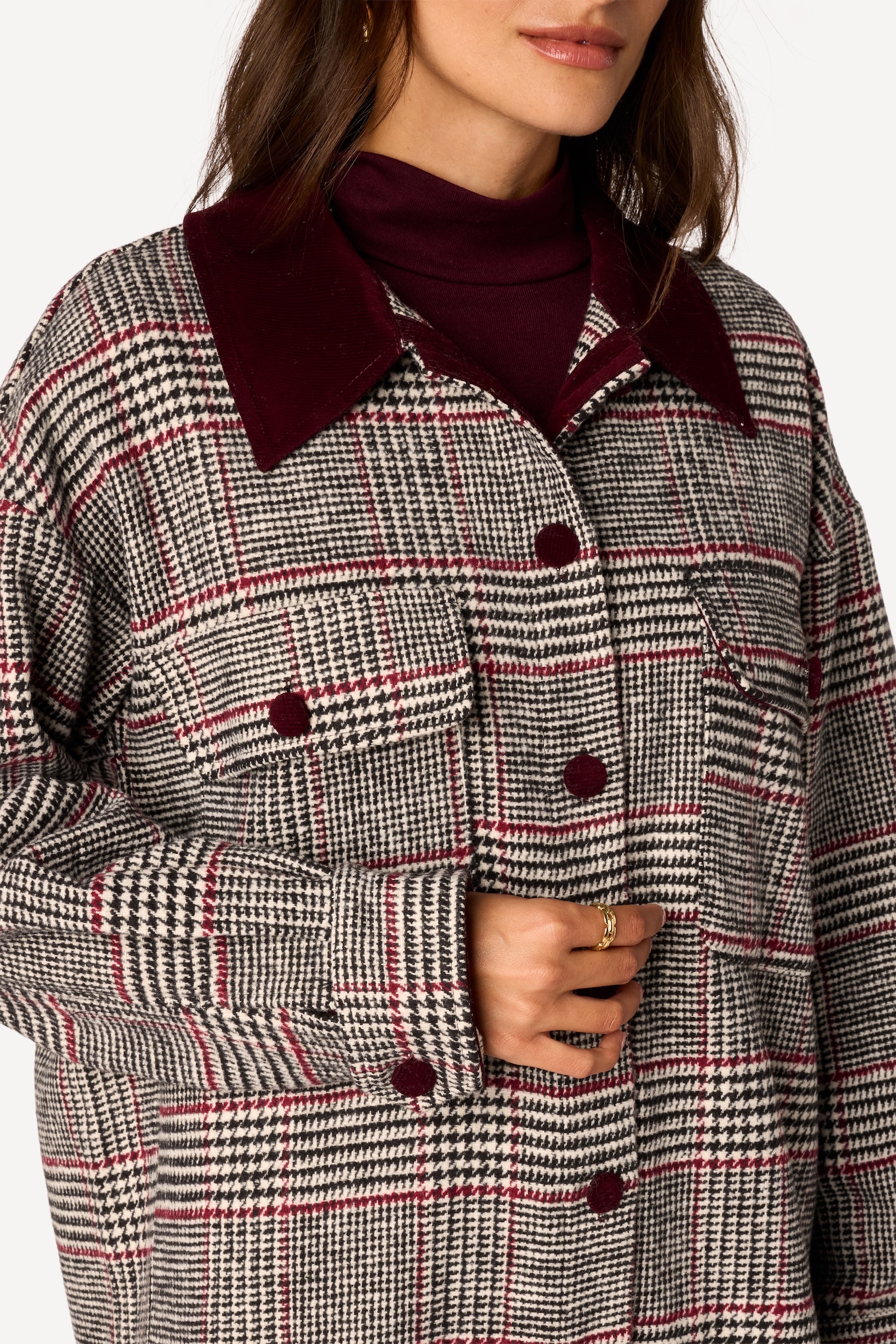 Col italien. Coupe droite et oversized. Poches plaquées devant, avec rabat et bouton. Mix and match de velours et feutrine pied-de-poule. Fermeture à boutons. Rappel velours sur les bords et aux poignets. Manches longues, poignet é boutons réglables. Longueur dos 80 cm